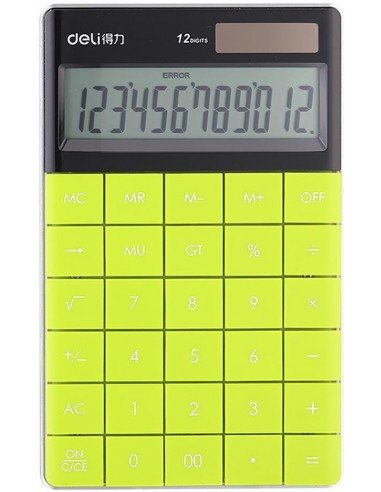 Αριθμομηχανή με οθόνη 12ψηφίων Deli. Έχει διαστάσεις: 16.5 x 10.3 cm και λειτουργεί με: Μπαταρίες / Ηλιακή Ενέργεια. Περιέχει μνήμες 4-key Memory