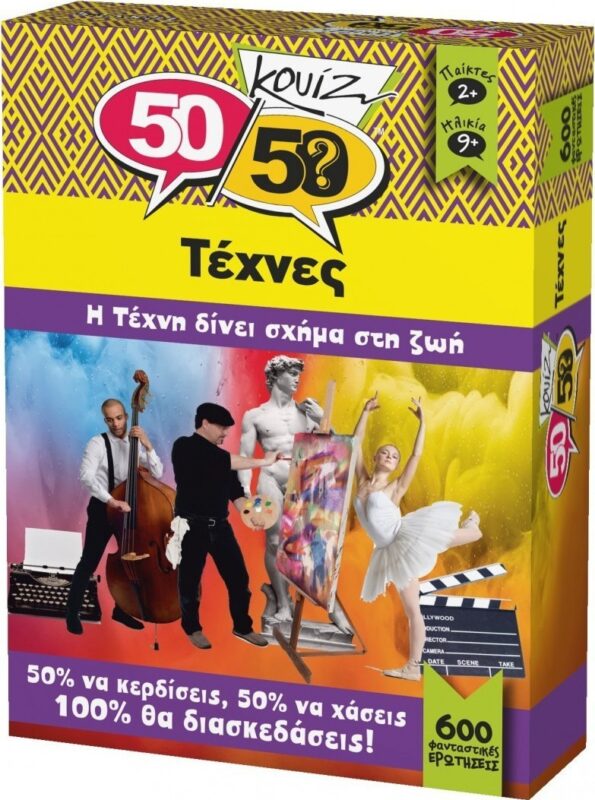Πόσοι Έλληνες λογοτέχνες έχουν τιμηθεί με Νόμπελ; Ο Πικάσο ή ο Ντα Βίντσι ζωγράφισε τη «Μόνα Λίζα»; Τέσταρε τις γνώσεις σου και συναγωνίσου τους φίλους σου με το νέο επιτραπέζιο ερωτήσεων 50-50 Κουίζ Τέχνες! Με 600 ερωτήσεις που καλύπτουν ποικίλα θέματα, μαθαίνεις τις πιο ενδιαφέρουσες και αξιοπερίεργες πληροφορίες.Κανόνες: Ρίξε το ζάρι και απάντησε στην ερώτηση. Αν απαντήσεις σωστά, κράτησε την κάρτα. Αν απαντήσεις λάθος, βάλε την κάρτα πίσω στη θέση της. Μάζεψε όσες περισσότερες κάρτες μπορείς και γίνε ο νικητής!