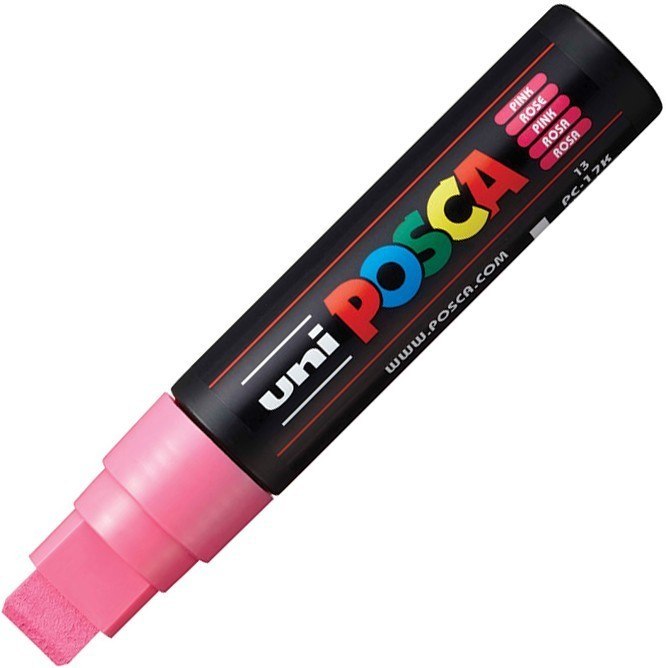 Posca Μαρκαδόροι Γίγας PC-17K με τετράγωνη μύτη 15mm που επιτρέπει τον άριστο έλεγχο της εφαρμογής. Το μελάνι του υδατοδιαλυτό με βάση το νερό, στεγνώνει πολύ εύκολα και μπορεί να εφαρμοσθεί σε όλα τα υλικά. Φεύγει πολύ εύκολα από γυαλιστερές επιφάνειες αλλά γίνεται μόνιμο σε πορώδες. Οι δημιουργίες σας μπορούν να γίνουν μόνιμες σε όλες τις επιφάνειες εσωτερικού ή εξωτερικού χώρου αν περασθούν με στερεωτικό βερνίκι. Κατασκευάζεται από την εταιρία UNI στην Ιαπωνία.