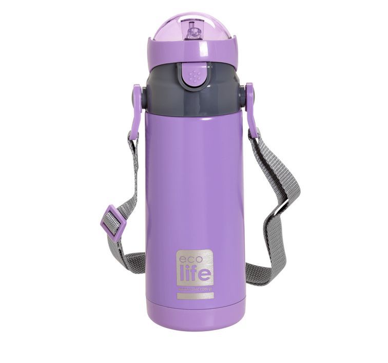 Μπουκάλι θερμός παιδικό 400ml με εσωτερικό καλαμάκι και ιμάντα μεταφοράς – Λιλά