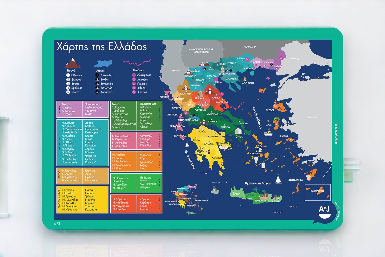 Με αυτό το σουπλά, μικροί και μεγάλοι ανακαλύπτουν την πανέμορφη Ελλάδα, ενώ μαθαίνουν να τοποθετούν στον χάρτη μεγάλες πόλεις, ποτάμια, βουνά και λίμνες. Συμπληρωματικά, ως βοήθημα στο μάθημα της Γεωγραφίας για μεγαλύτερα παιδιά περιλαμβάνεται λίστα με όλους τους Νομούς και τις πρωτεύουσές τους.