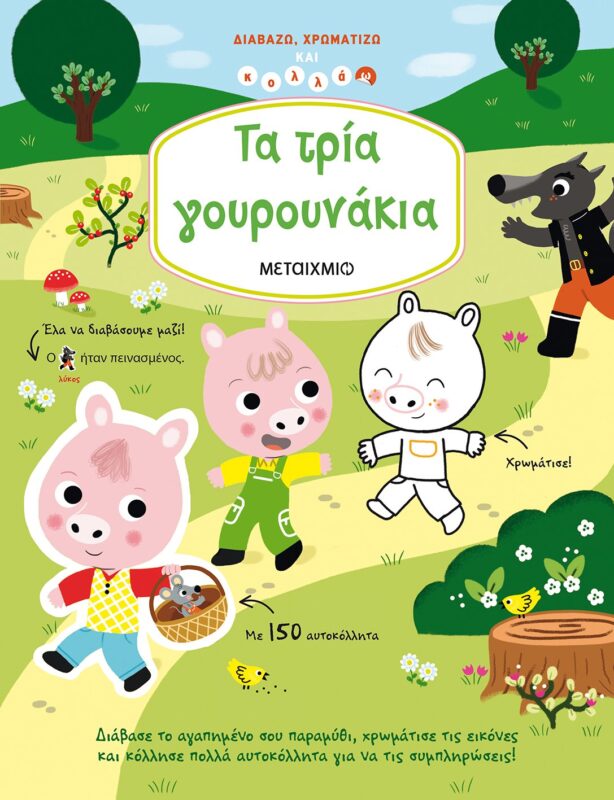 Περιλαμβάνει τέσσερις σελίδες με αυτοκόλλητα, καθώς και πολλά σαλόνια για να τα χρωματίσει το παιδί.